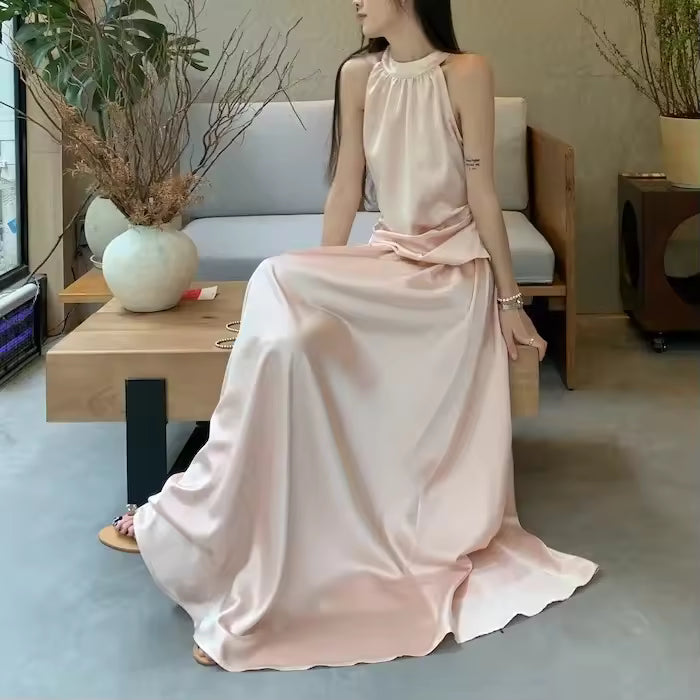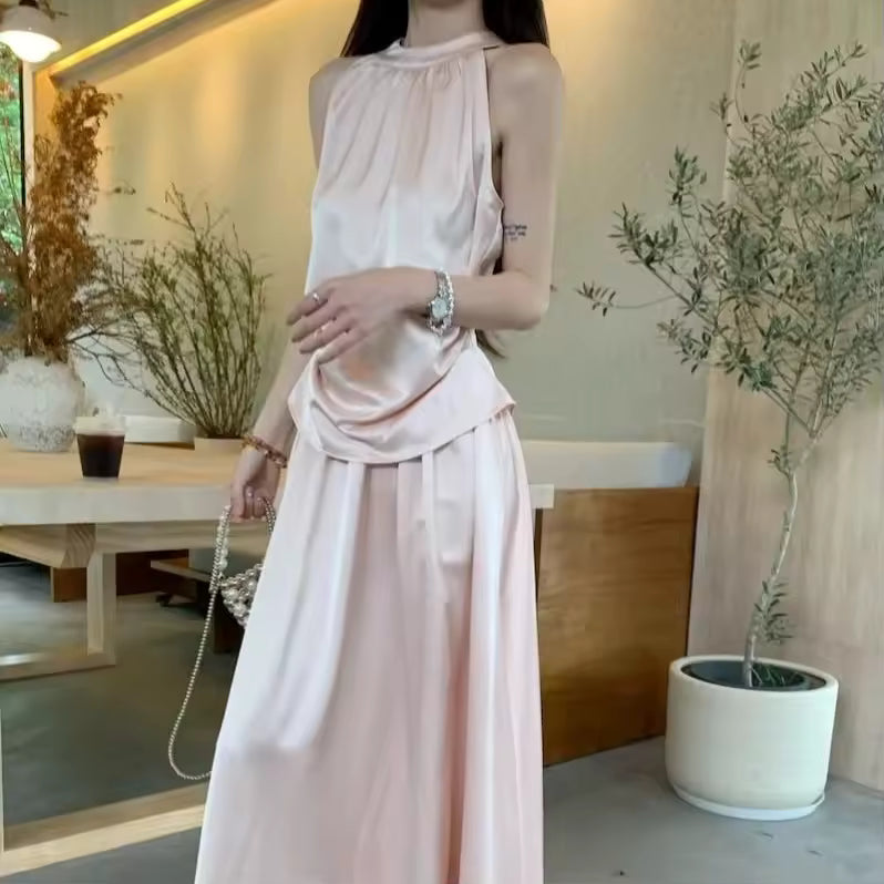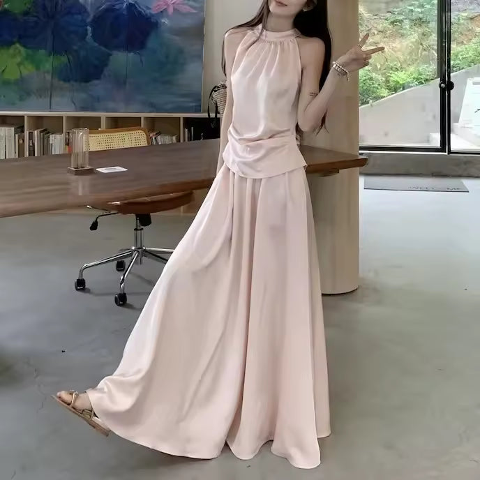 The halter-neck vest top highlights the shoulders and neckline, while the high-waist design enhances the silhouette for a flattering, elegant fit.