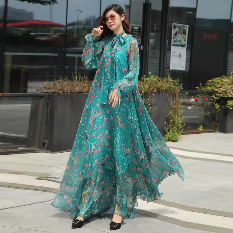 Delicate floral prints and long, flowing chiffon sleeves create a romantic, airy vibe. The lightweight fabric moves beautifully with every step, giving an elegant boho look. Its versatile design flatters all body types, including plus-size figures, making it ideal for effortless summer style.