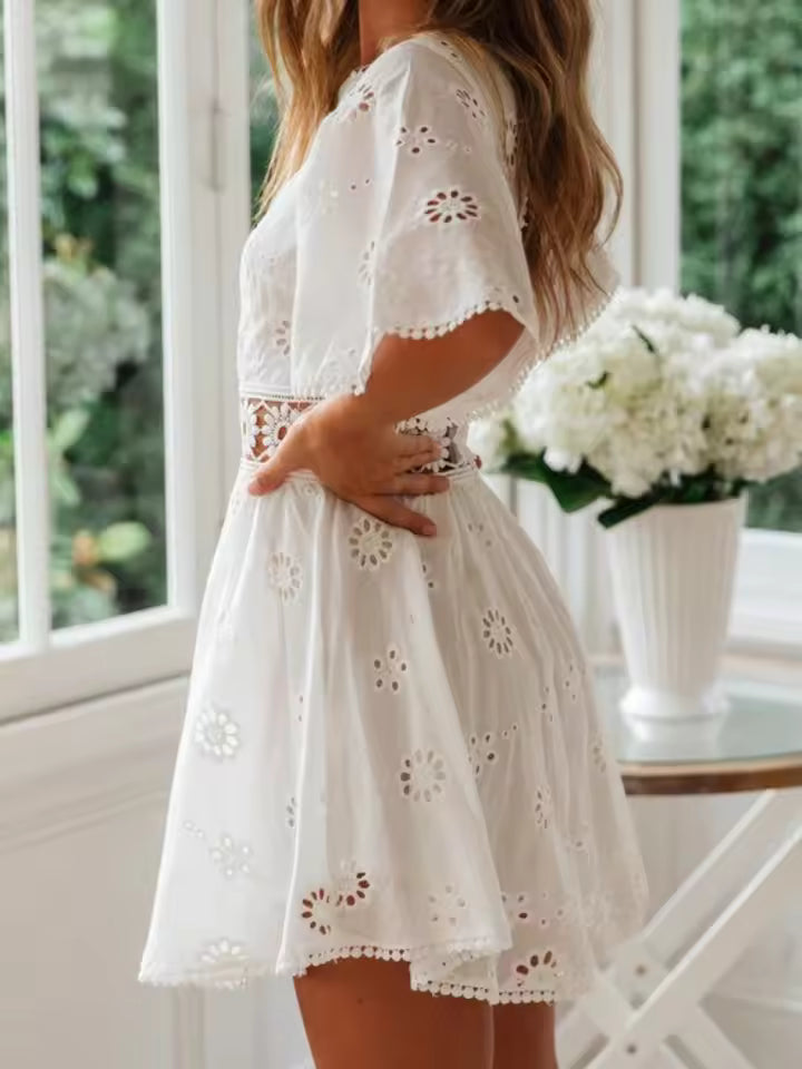 This dress features delicate floral embroidery that adds a touch of romance and sophistication. The hollow-out detailing and backless design create a playful yet elegant style, perfect for showing off a subtle summer glow. Its mini length enhances the youthful, chic look, making it a standout piece for any occasion.