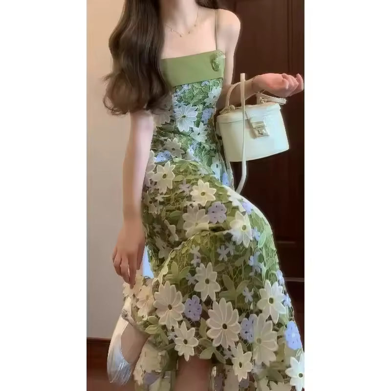 The mint jasmine green dress embodies romantic French style with a soft, graceful design. Its fresh green tone adds elegance and charm, perfect for summer wear.